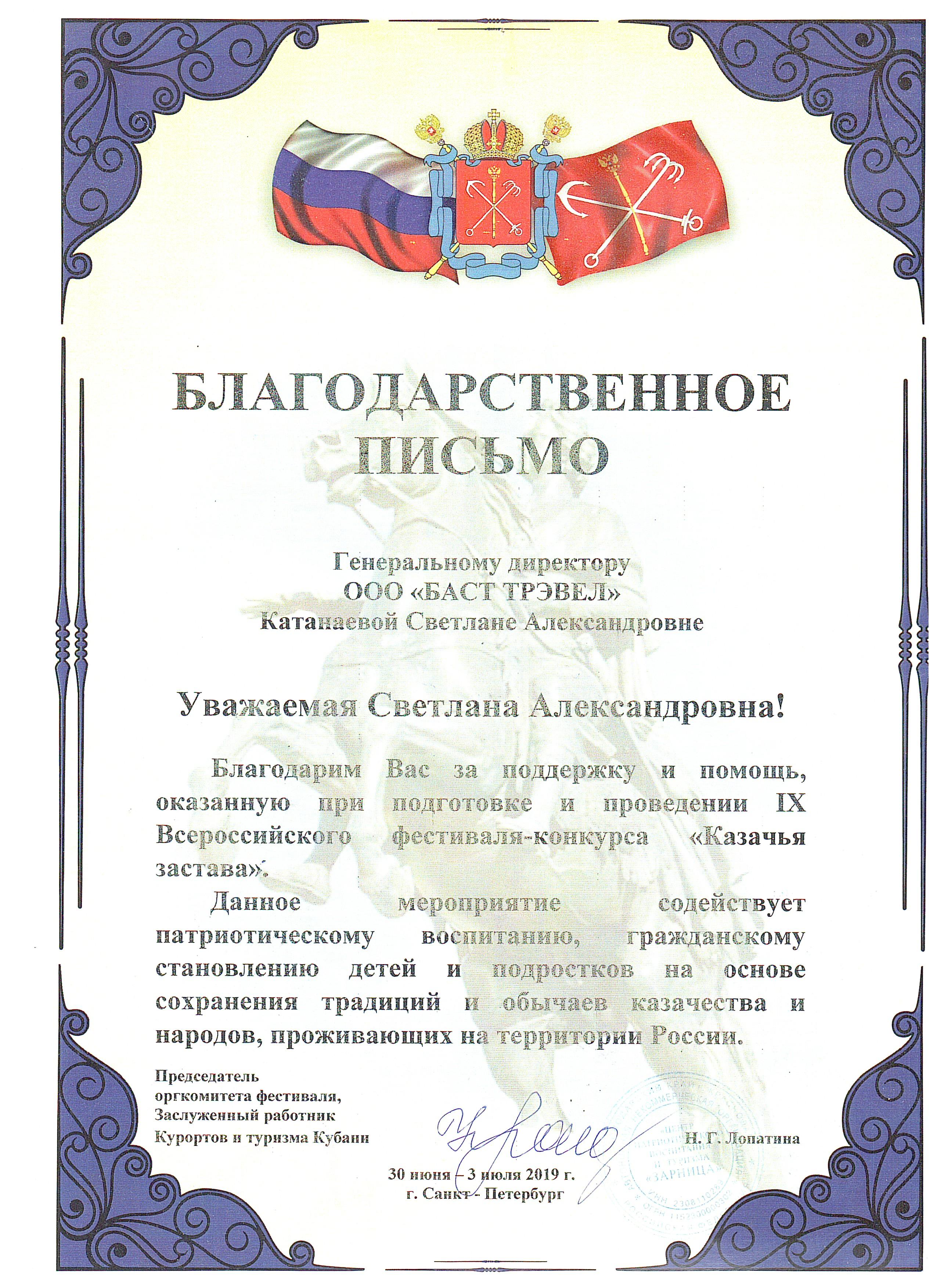 09.01.2020«Мы – Тавричане! Участники фестиваля «Казачья застава» благодарим Вашу турфирму за организацию экскурсий и особенно Светлану Юрьевну за ее работу. Спасибо за прием в «Отеле 365» всем сотрудникам благодарность. Успехов всем и процветания.»